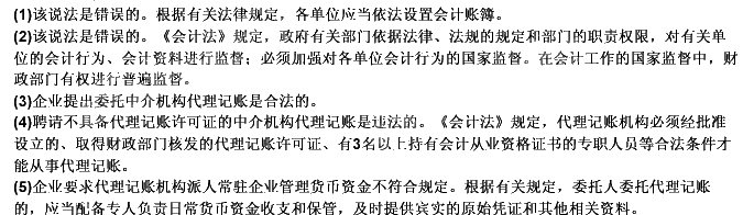 (1)该合伙企业经营规模不大,总共只有8位员工,没有建立完整的账项记录。企业方认为合伙企业无独立企业法人地位,每位合伙人依法承担无限连带责任,所以可以不用建账。(2)该合伙企业中没有国有资产投入,企业认为无须接受国家监督,财政部门的检查属于政府对合伙企业正常经营的不当干预。(3)财政部门要求该企业根据业务需要设置会计机构,或者在有关机构中设置会计人员并指定会计主管人员。企业考虑自身人员结构条件,提出委托某中介机构代理记账。(4)企业拟委托的某中介机构系从事投资咨询业务的,只有l名会计人员持有会